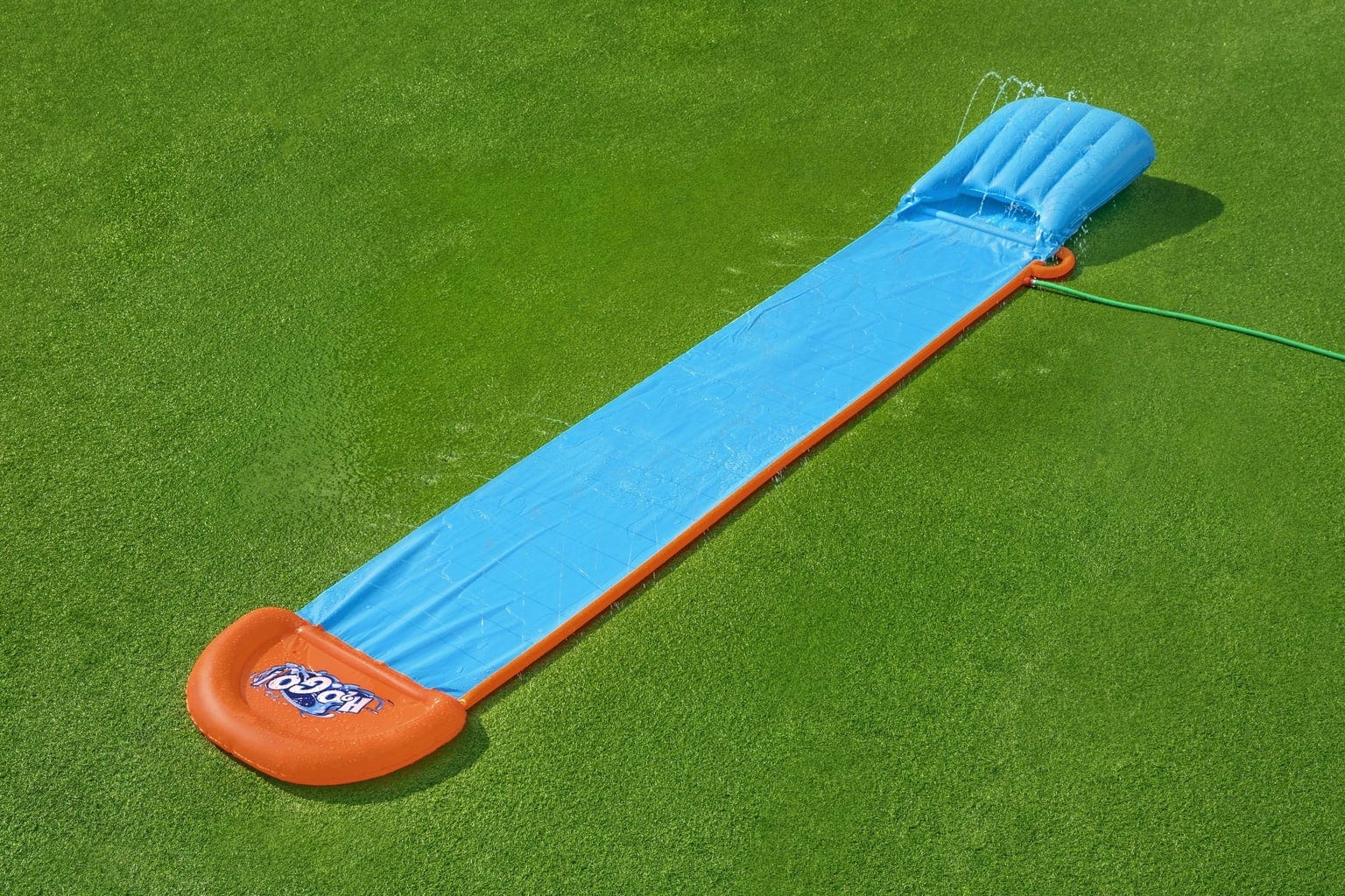 Dar asta nu e tot. Tehnologia inovatoare SplashBoost™ a aspersoarelor se conectează direct la furtunul de grădină și garantează o umezire uniformă și eficientă a întregului tobogan. Fără opriri, fără blocări – doar distracție pură de alunecare. Și la sfârșit? Te așteaptă un mic bazin de aterizare - transformă-ți grădina în centrul atracției verii!