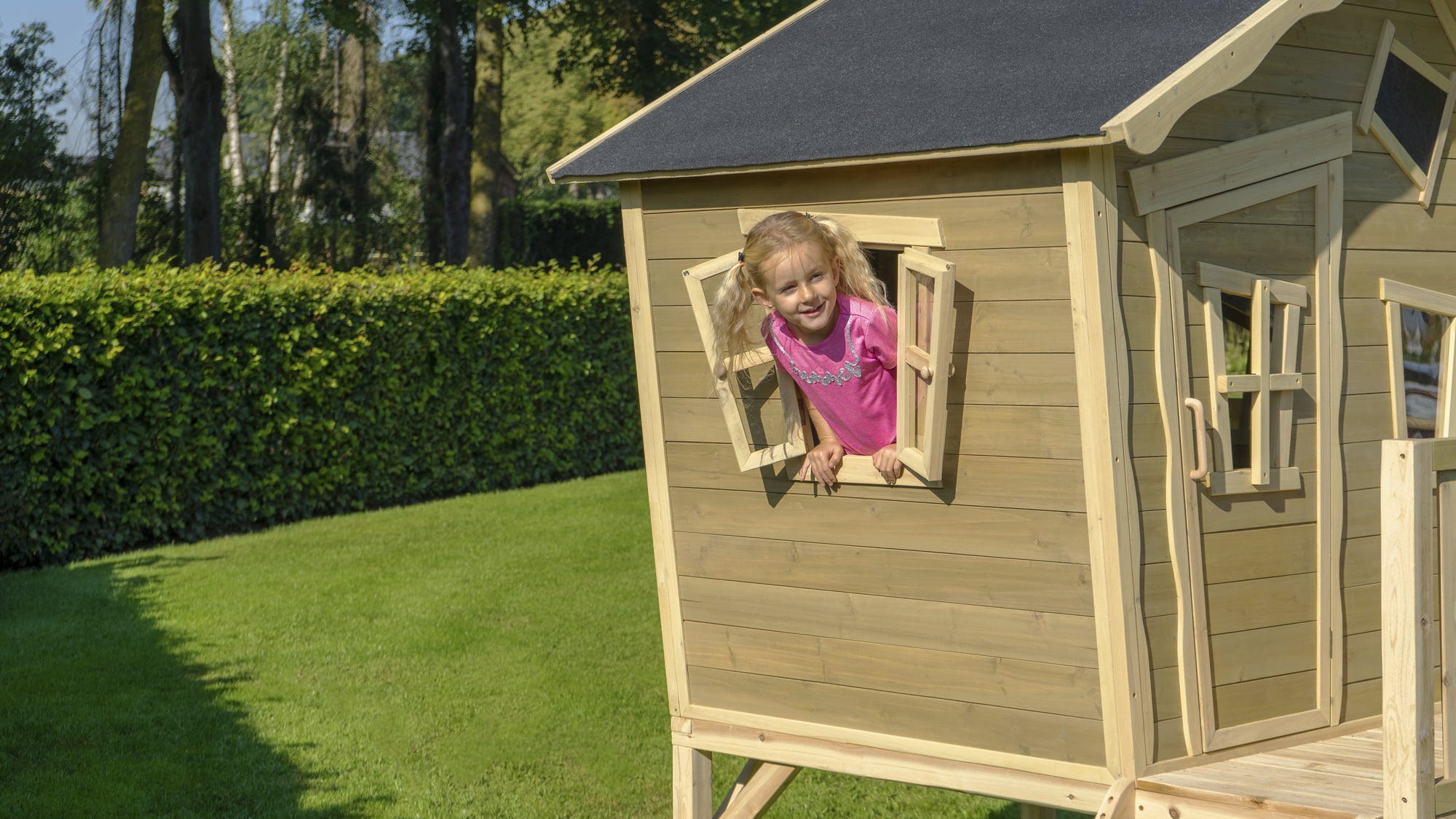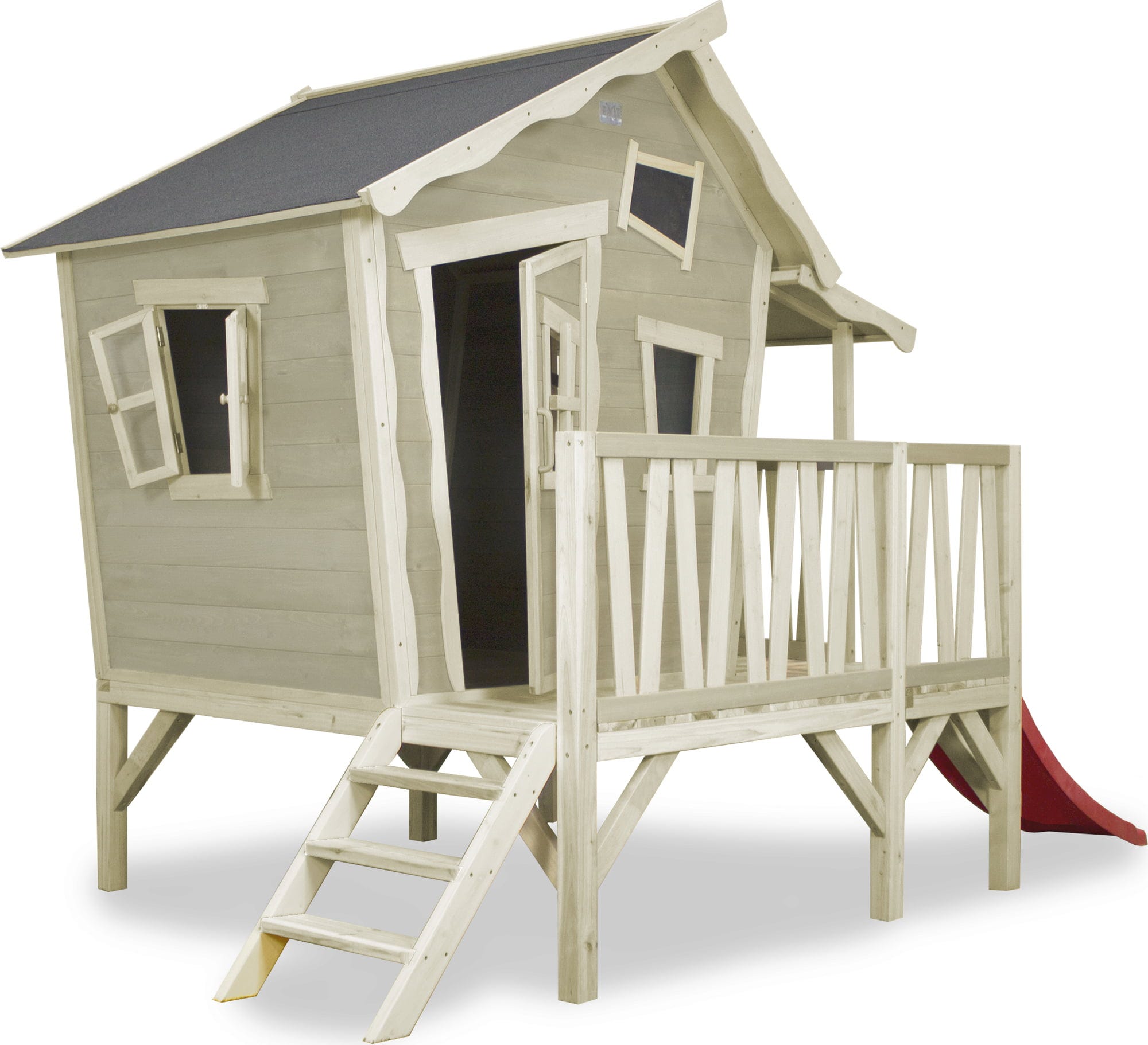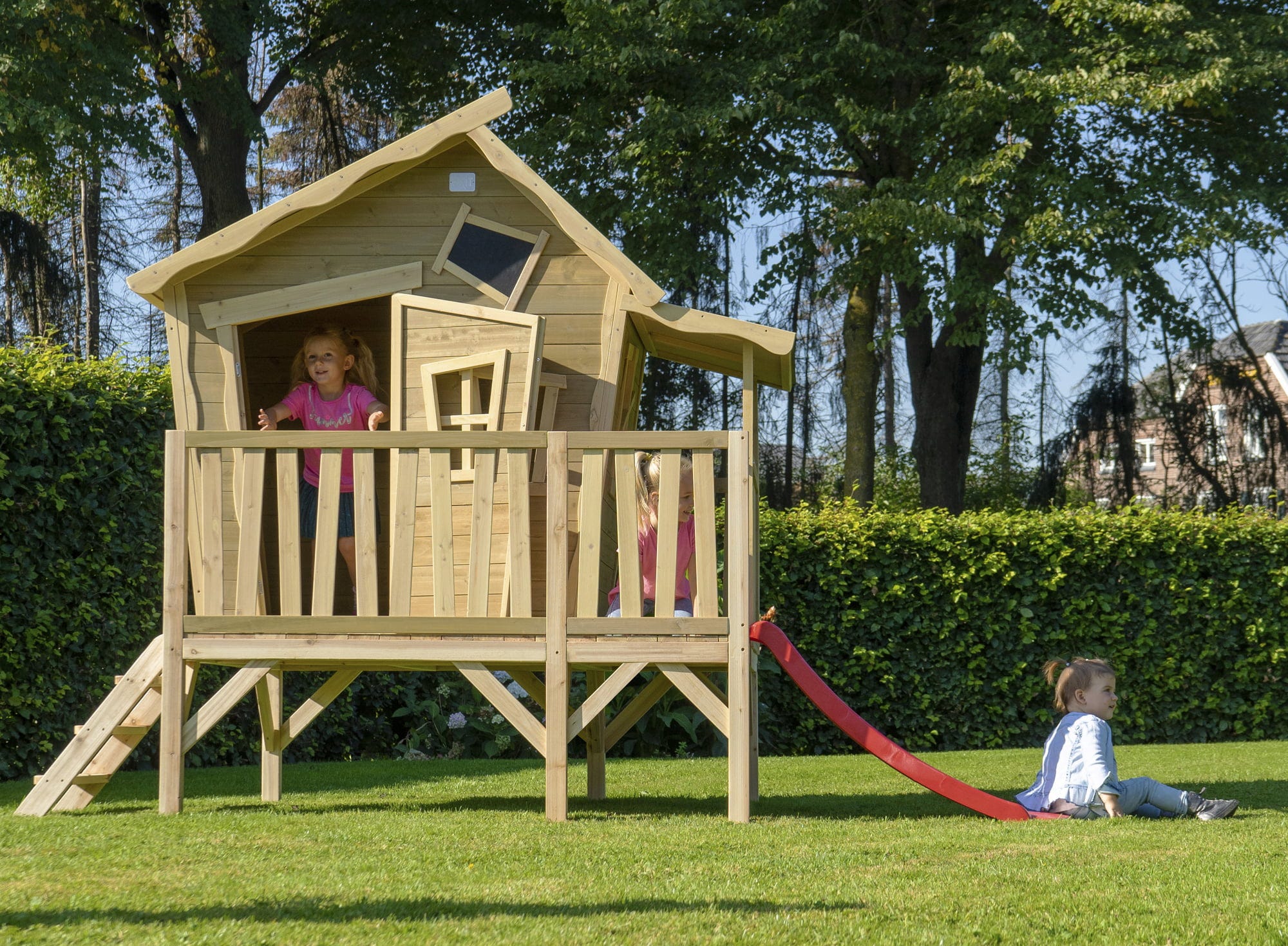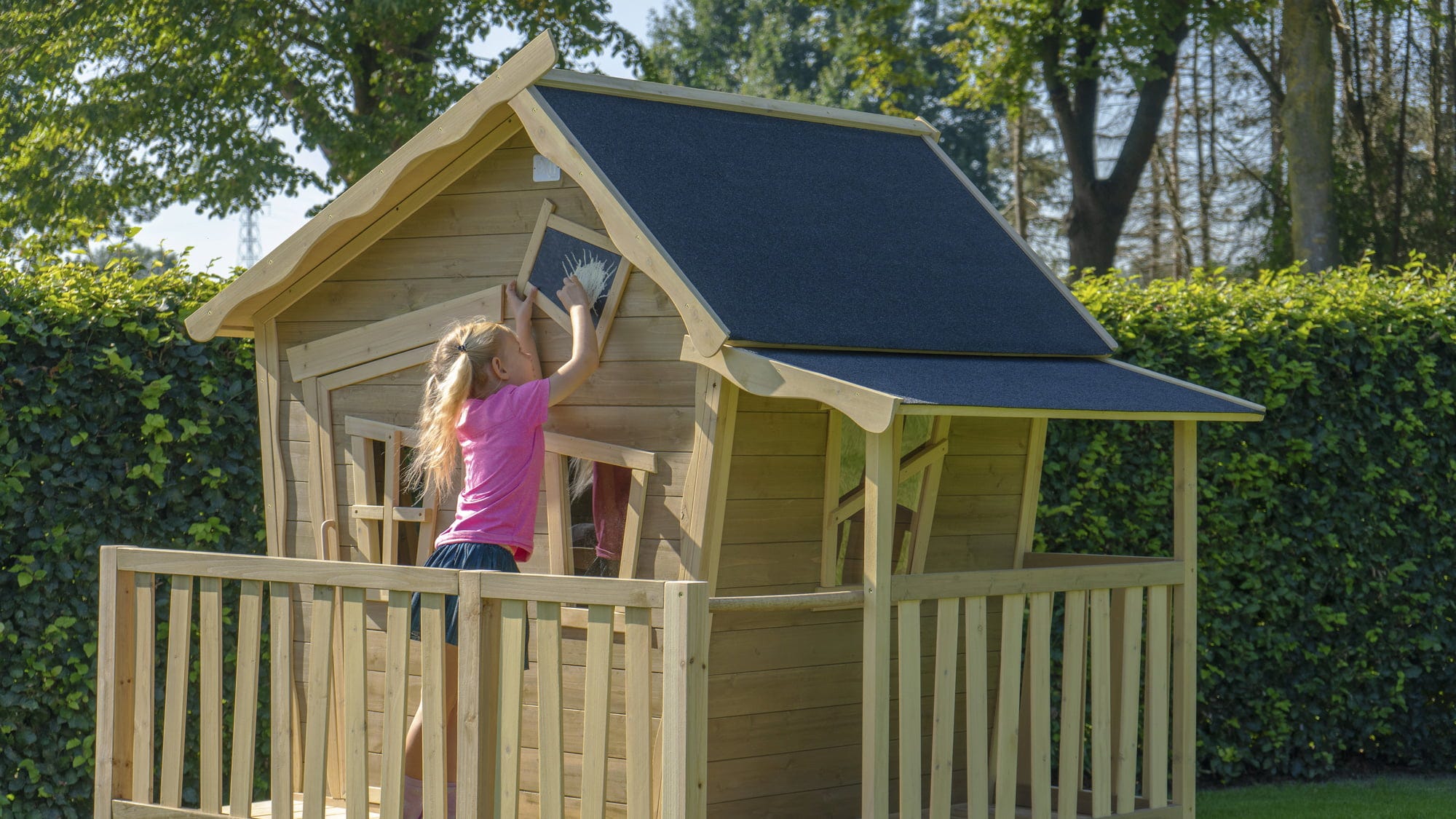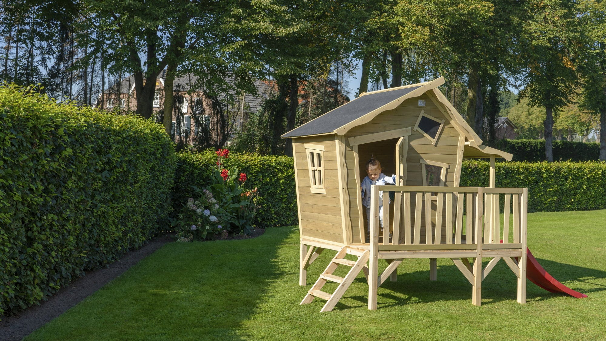 O căsuță durabilă, rezistentă la intemperii, cu verandă și tobogan - Casa este fabricată din lemn de cedru certificat FSC® (FSC 100%, FSC® SCS-COC-007799) și dispune de un acoperiș impermeabil din bitum. Componentele preasamblate ușurează montajul și permit asamblarea într-un timp scurt. Lemnul nu se desface în așchii și este rezistent la putrezire. O adevărată oază pentru copii.