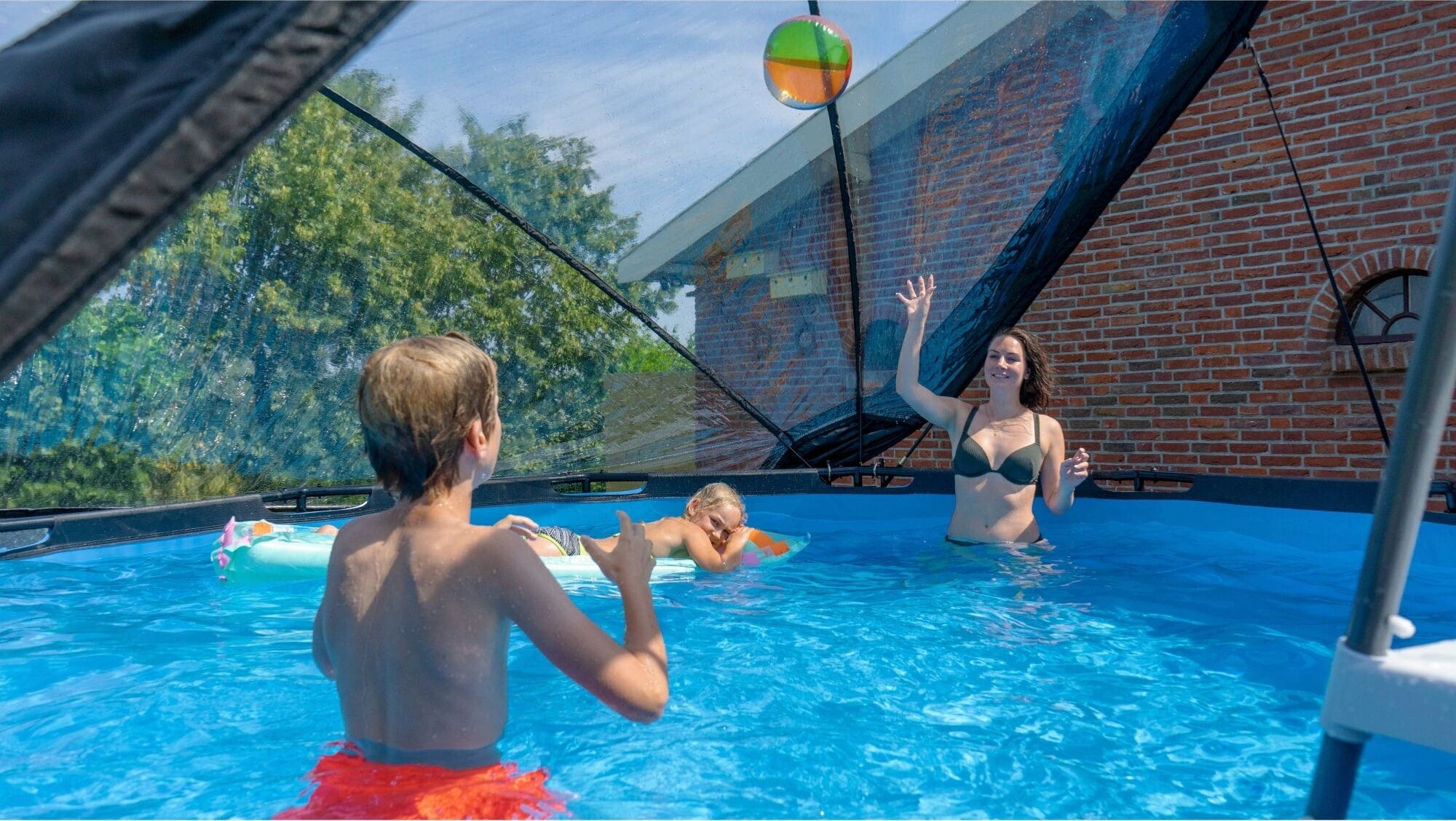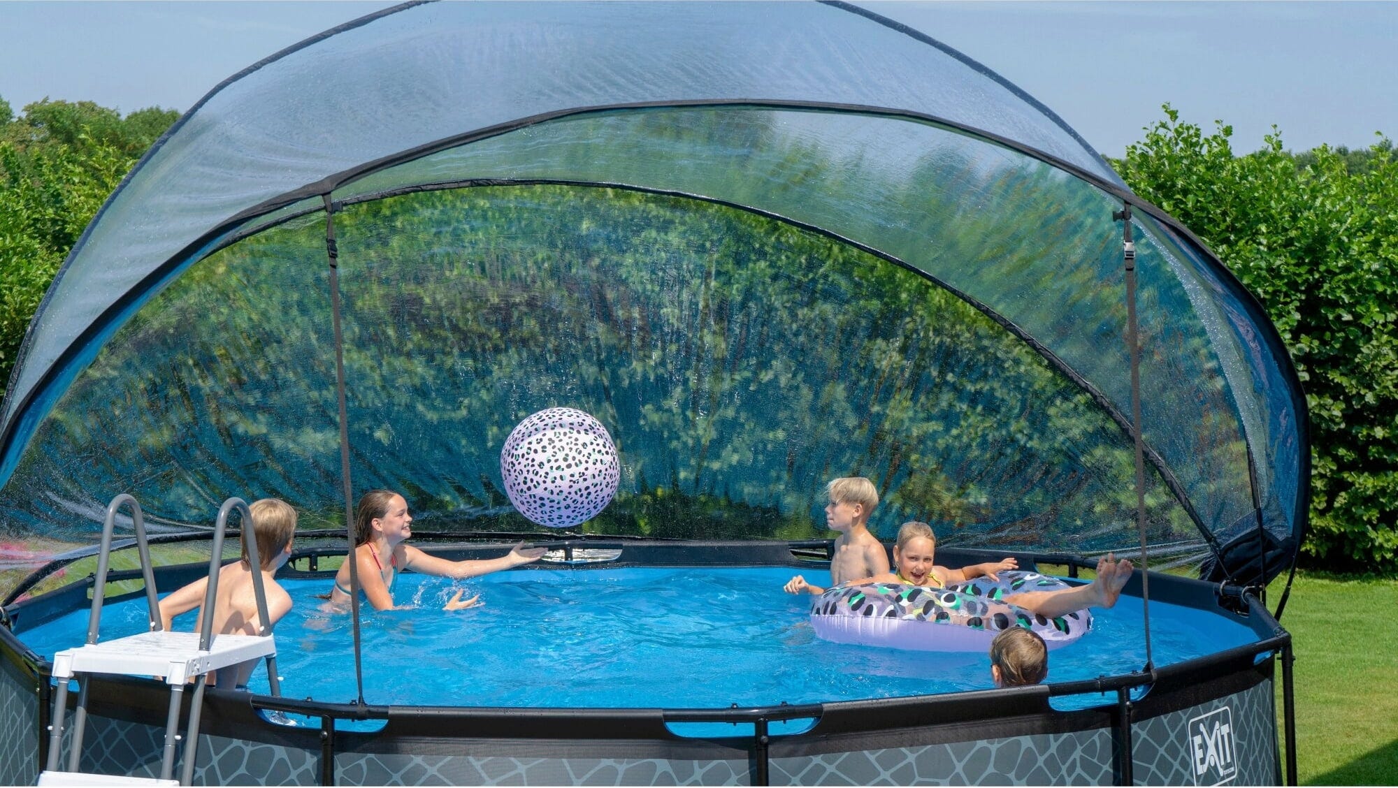 Prelata EXIT protejează împotriva ploii, vântului și murdăriei și îți dă senzația că înoți în propria ta piscină acoperită. După cum dorești și în funcție de vreme, poți lăsa cupola transparentă pe jumătate deschisă sau o poți închide complet în timpul băii.