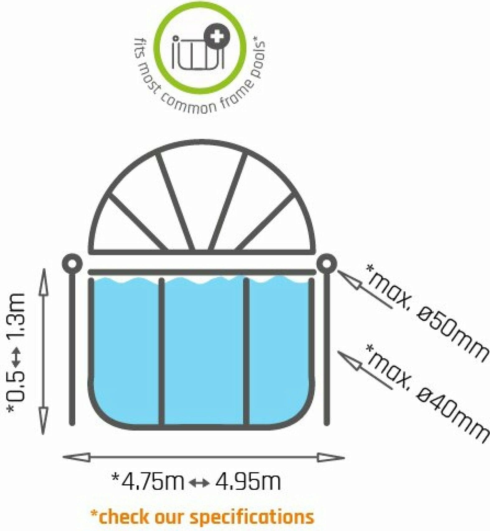 Acoperirea este potrivită nu doar pentru piscinele cu cadru de la EXIT Toys, ci și pentru piscine cu cadru de la alți producători cu un diametru de 475 - 495 cm. Condiții pentru compatibilitate sunt un număr par de picioare cu un diametru de maxim 40 mm și o șină superioară rotundă cu o grosime maximă de 50 mm.