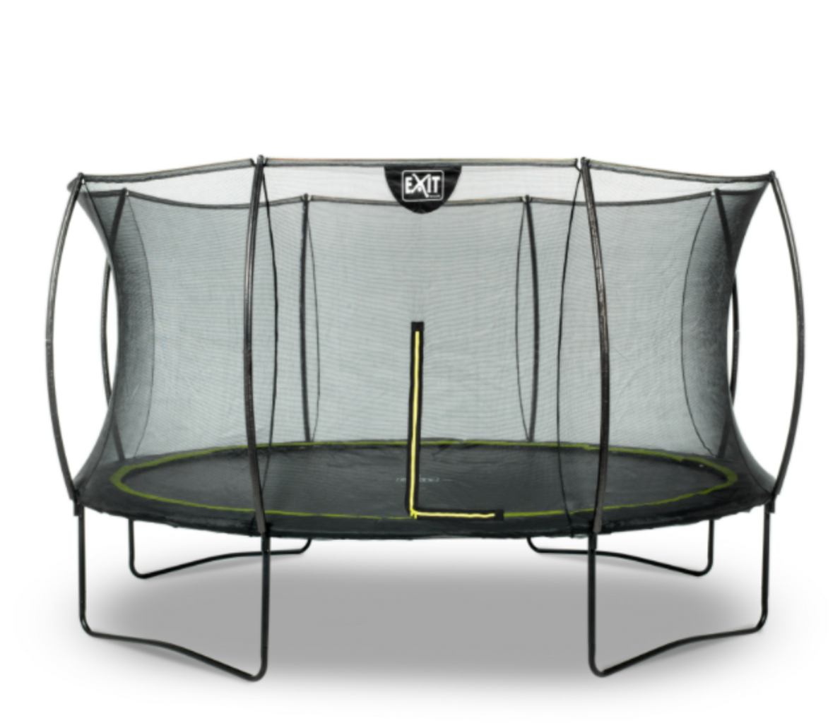Trambulina sigură pentru un plus de distracție în grădină - Trambulina rotundă Silhouette de la EXIT Toys este echipată cu plasă de siguranță și patru picioare metalice în formă de W. Stâlpii curbați pe partea exterioară asigură că plasa de protecție este foarte bine întinsă și copiii tăi nu se pot prinde de ea. Fermoarul verde proeminent de la plasa de siguranță îți arată imediat dacă închiderea este bine și sigur închisă.