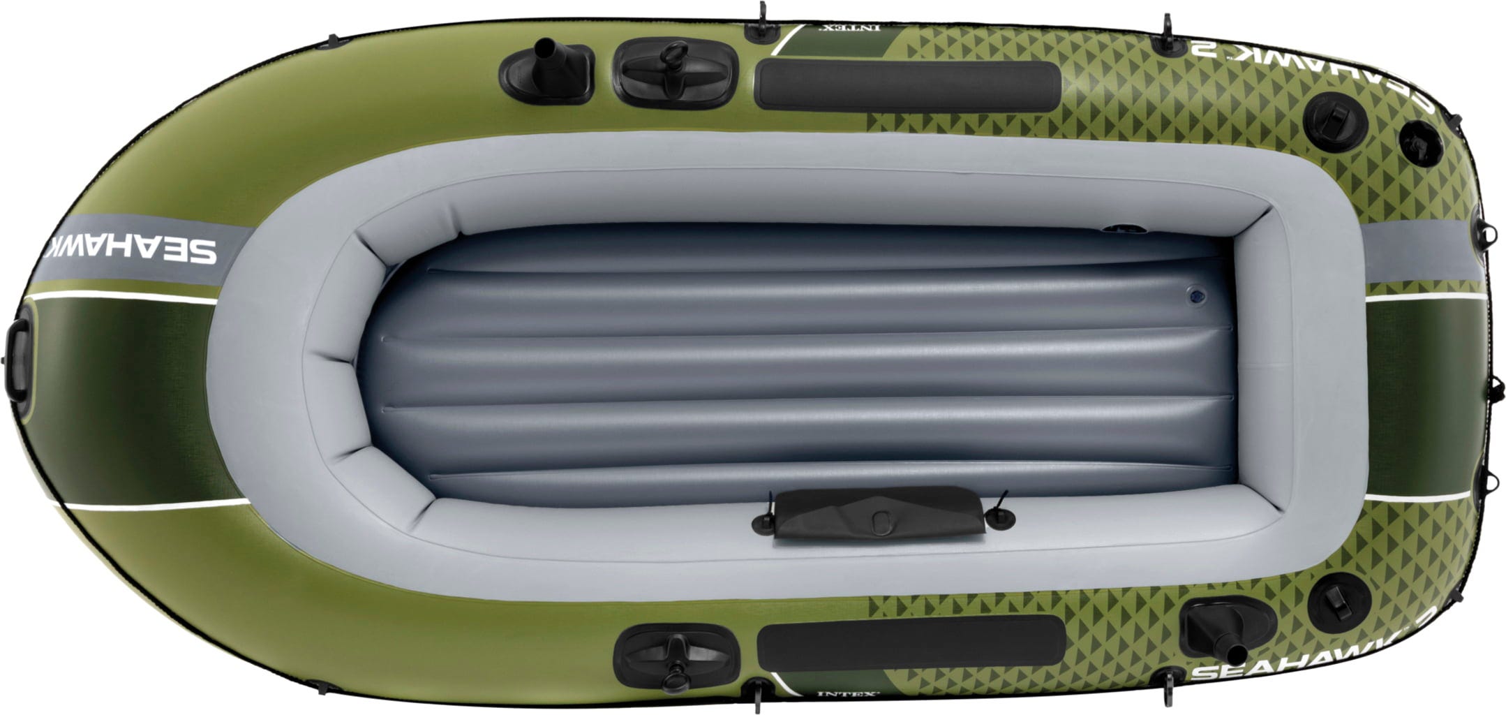 Bărci pneumatice INTEX Seahawk 2 oferă pasionaților de agrement și pescuit o bază de încredere pentru excursii pe lacuri sau râuri liniștite. În pachet sunt incluse două vâsle și o pompă manuală puternică.