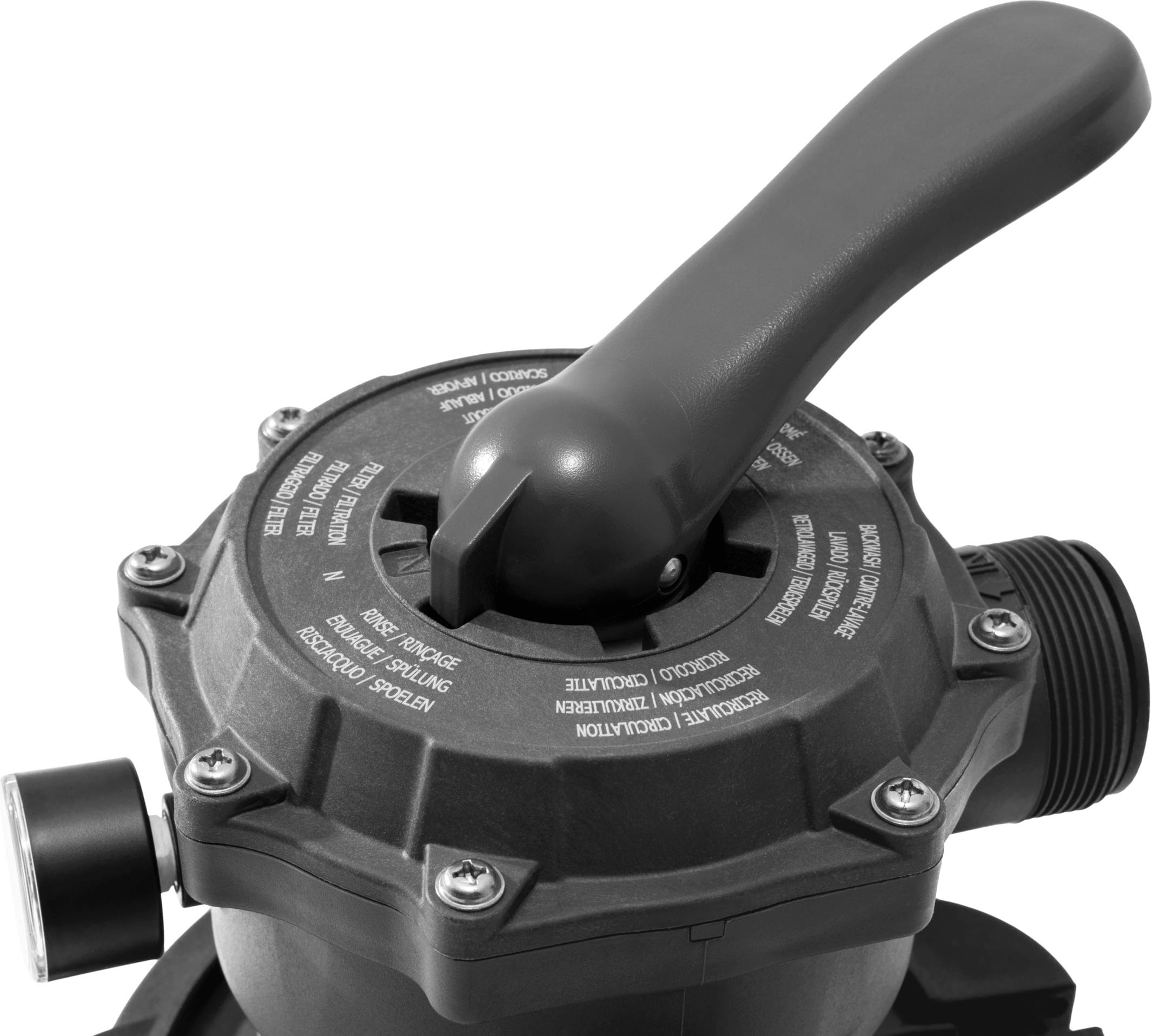 - Ventil cu 6 funcții – Permite filtrare, spălare inversă, clătire, circulație, golire & închidere.