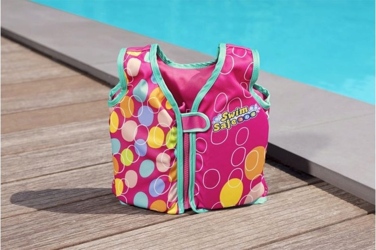 Táto farebná plavecká vesta poskytuje potrebnú bezpečnosť na pláži, pri rybníku alebo v bazéne, takže aj malé deti sa môžu čľapkať vo vode. Textilný poťah je pohodlný na nosenie a zabudovaná penová výplň udrží hornú časť tela na vodnej hladine. Popruh je navyše flexibilne nastaviteľný, takže záchrannú vestu možno nosiť niekoľko plaveckých sezón za sebou.
