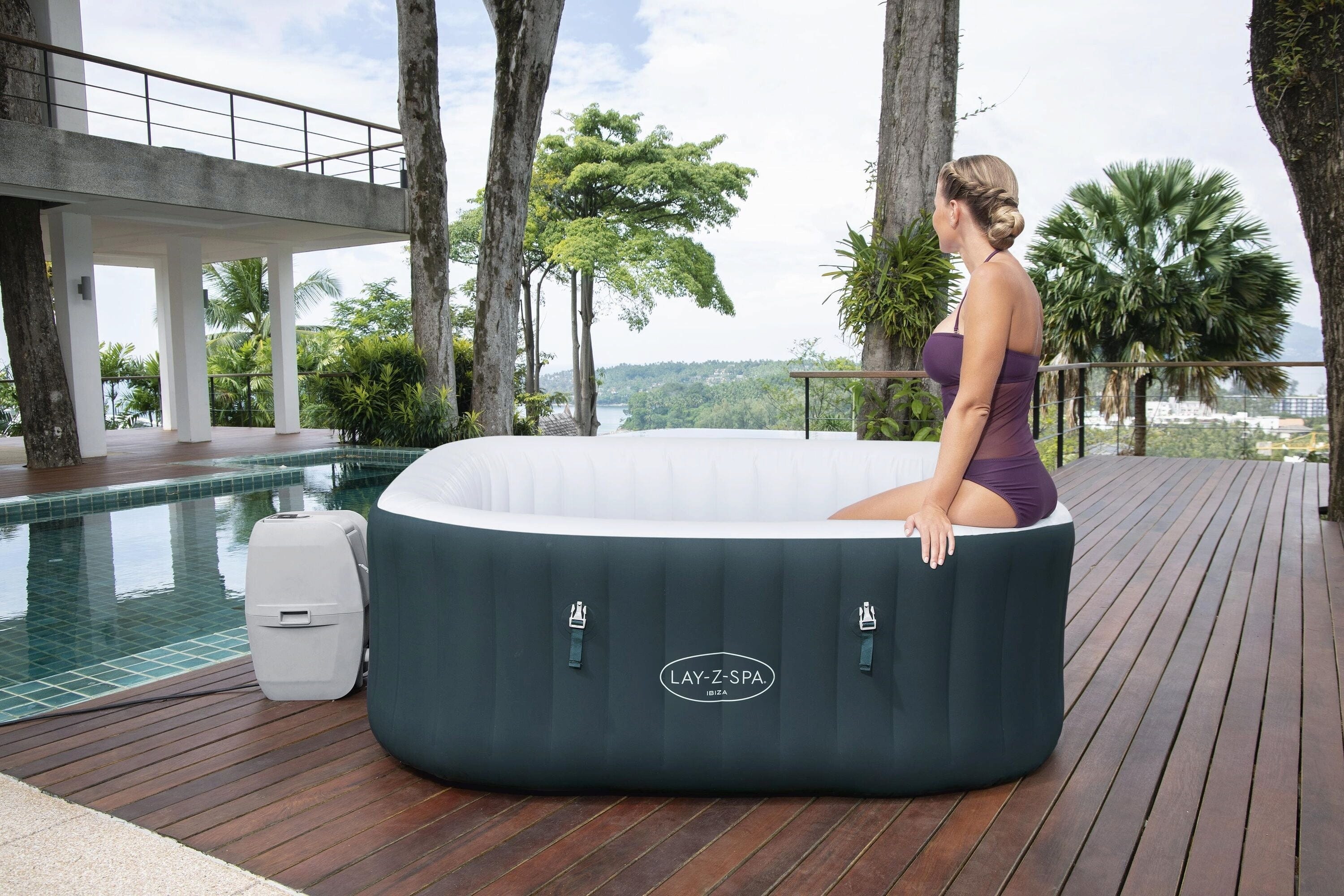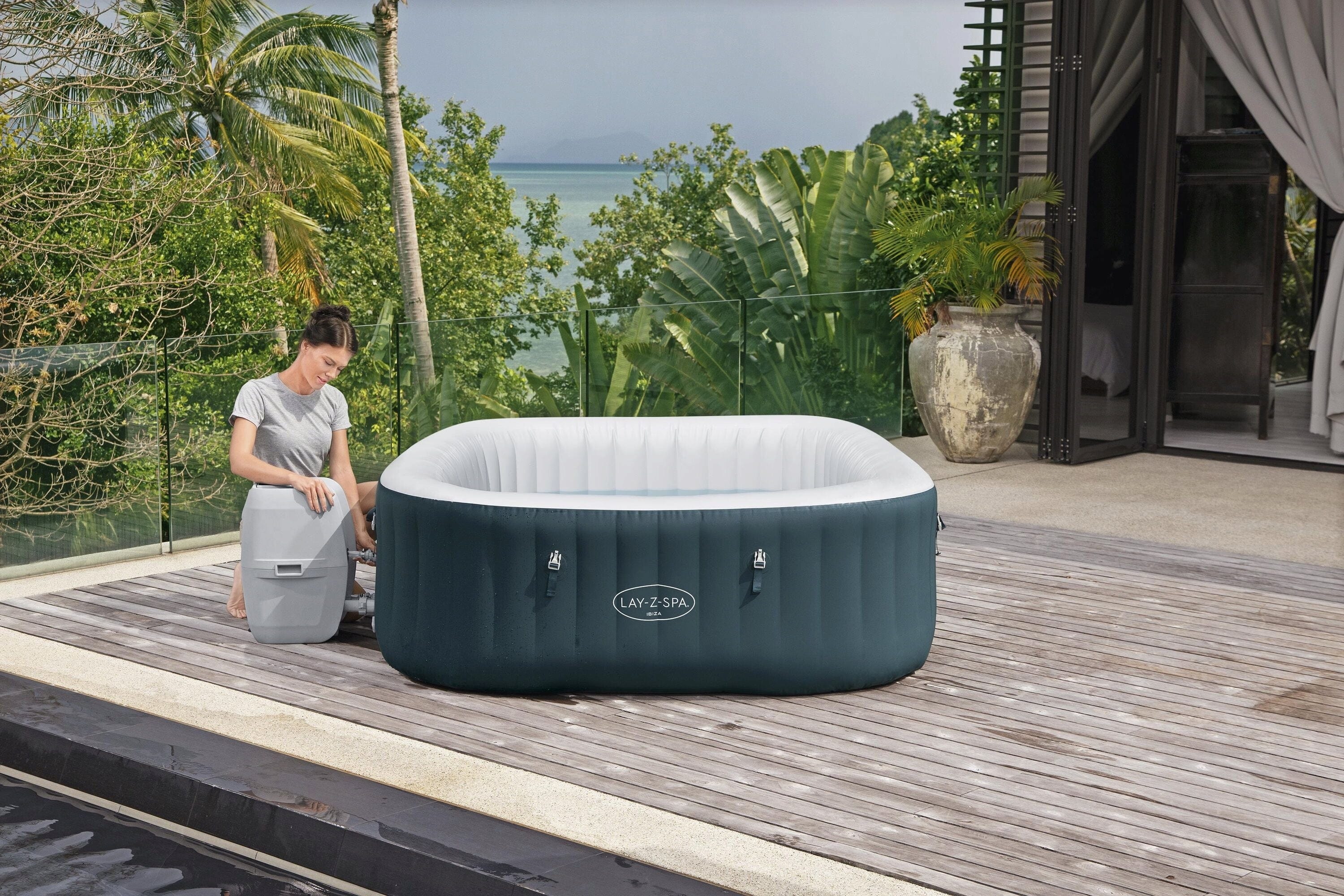 Pohodlne sa ovláda pomocou výklopného digitálneho ovládacieho panela, pomocou ktorého si dokonca môžete naplánovať časový limit pre kúpeľ až na 40 dní dopredu vďaka energeticky úspornému časovaču. Na Ibiza AirJet sa môžete spoľahnúť aj počas chladných dní: integrovaný Freeze Shield zabraňuje zamrznutiu technológie automatickým ohrevom vody od teploty 6 °C a viac. Bezpečnosť zaisťuje uzemňovacia kontrola, prúdový chránič a detská poistka na clip-uzáveroch. Vďaka multifunkčnej jednotke čerpadla, ktorá slúži aj ako odkladacia plocha a držiak na poháre, ju možno nastaviť v priebehu chvíľky bez použitia náradia.