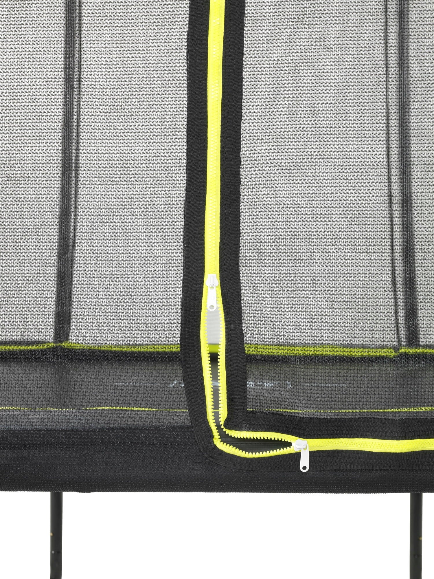 Veľká, okrúhla trampolína s ochrannou sieťou a štyrmi kovovými W-nohami zaručuje optimálnu zábavu pri skákaní na záhrade. 80 pružín zaručuje optimálny odraz s maximálnou zábavou. Osem stĺpikov natiahne sieť tak tesne, že sa do nej deti nemôžu zachytiť. Matný čierny, kvalitný ochranný rám pokrýva pozinkované pružiny. Do ochranného rámu je navyše integrovaná ochrana chodidiel, ktorá zabraňuje tomu, aby sa nohy detí dostali medzi pružiny. Na základe nápadného zeleného zipsu môžete vidieť, či je bezpečne zapnutý. Konštrukcia je tiež pozinkovaná a povrchovo ošetrená práškovaním, čo trampolínu chráni voči korózii.