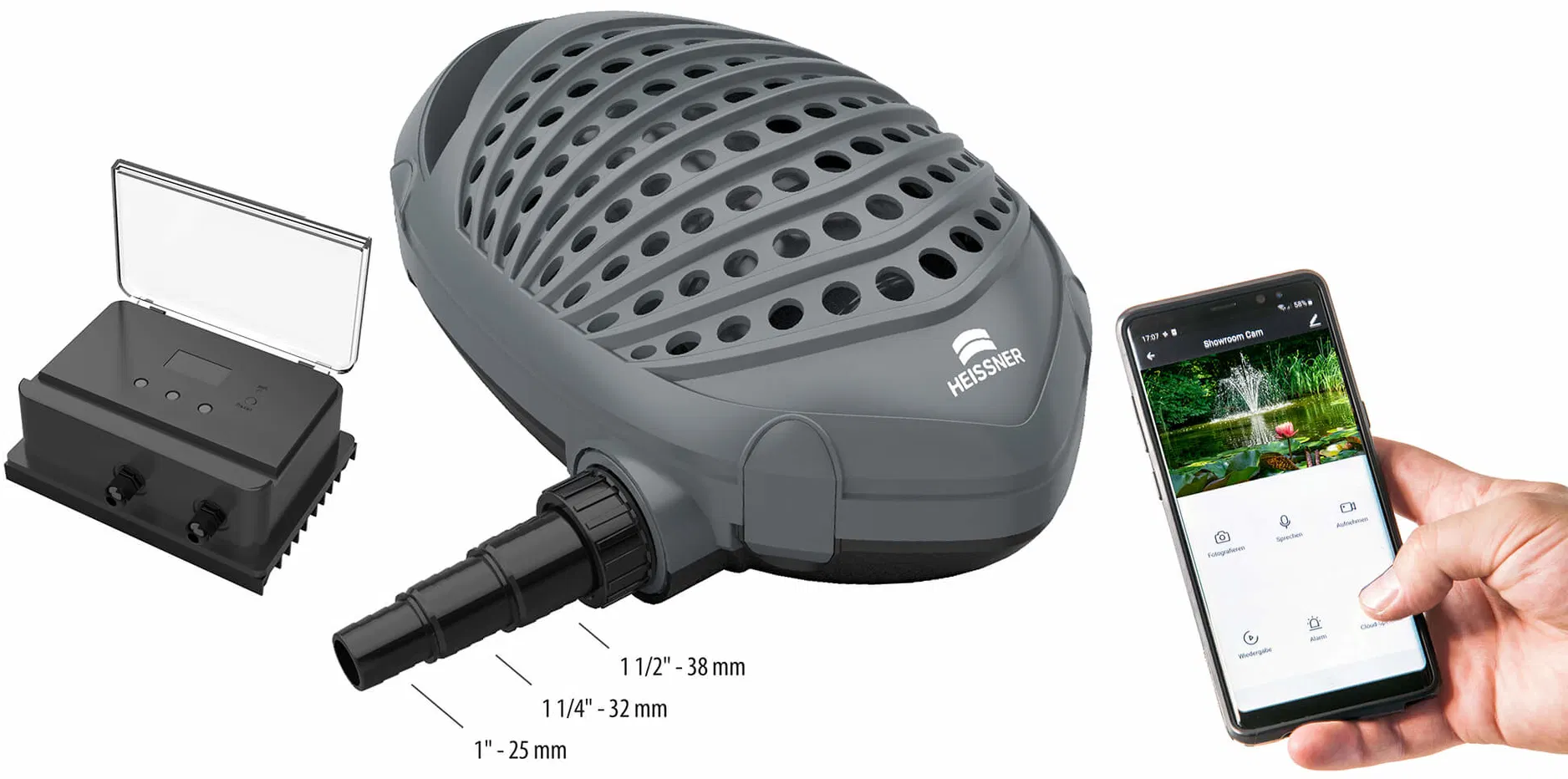 Filtračné čerpadlo HEISSNER Aqua Craft Eco Smart možno ovládať nielen pomocou priloženého externého ovládača, ale vďaka bezplatnej aplikácii Smart Garden je aj plne prepojené sieťou: regulácia prietoku, nastavenie presných časovačov a hlasové ovládanie sa pohodlne vykonávajú prostredníctvom smartfónu. Toto vysokovýkonné čerpadlo navyše zaujme svojou energeticky úspornou prevádzkou, maximálnou spoľahlivosťou a odolnosťou. Súčasťou balenia je hrot do zeme a držiak na montáž na stenu.