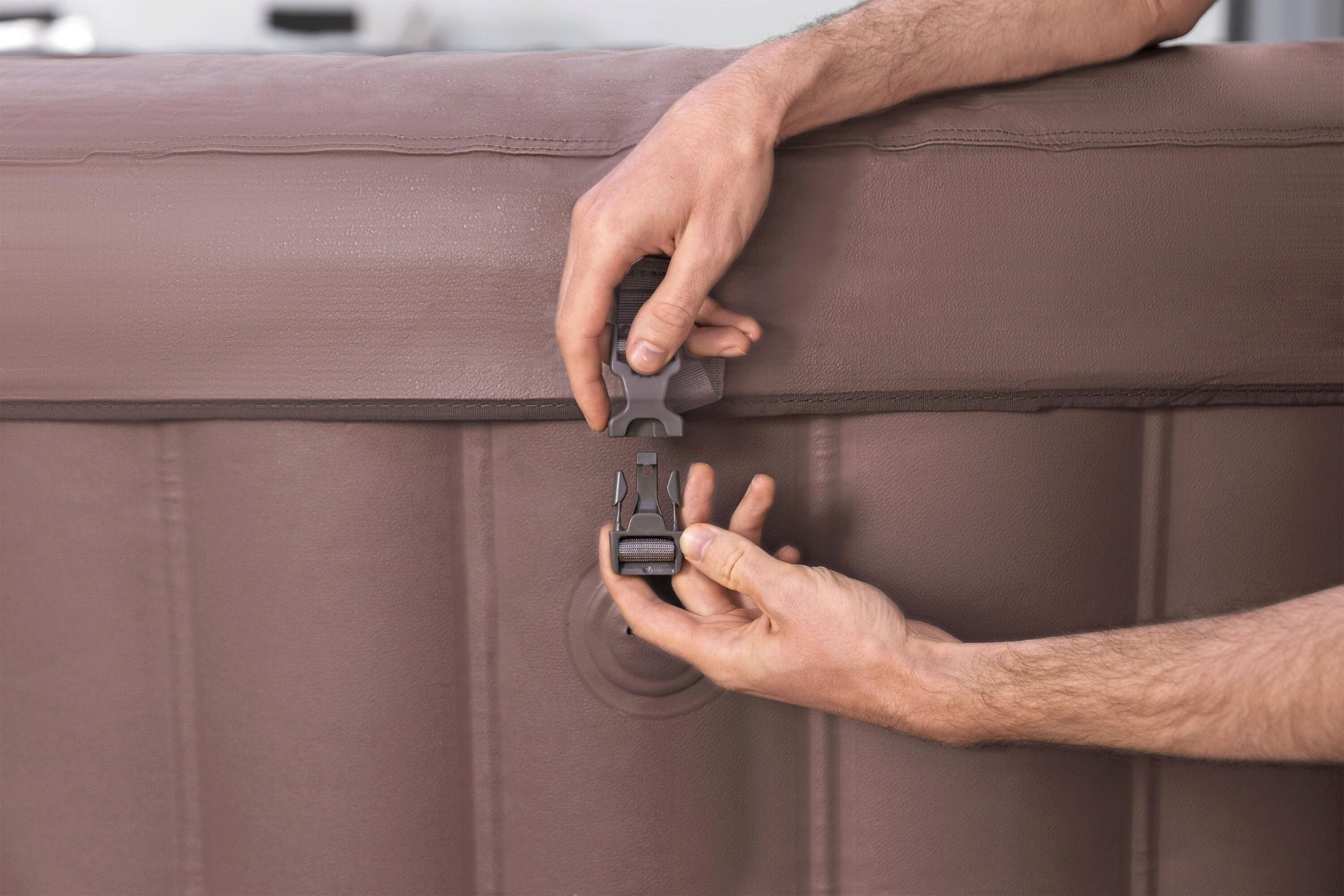 LAY-Z-SPA® Hawaii AirJet från Bestway bjuder in till avkopplande stunder för upp till 6 personer - på Ø 196 cm. Den terrakottafärgade utsidan kombineras med en polygonmönstrad botten för en stilren och modern känsla. 140 AirJet™-dysor ger en behaglig massage med varm luft.